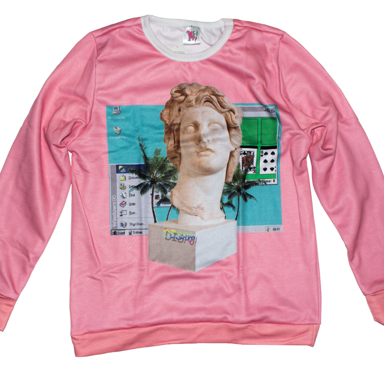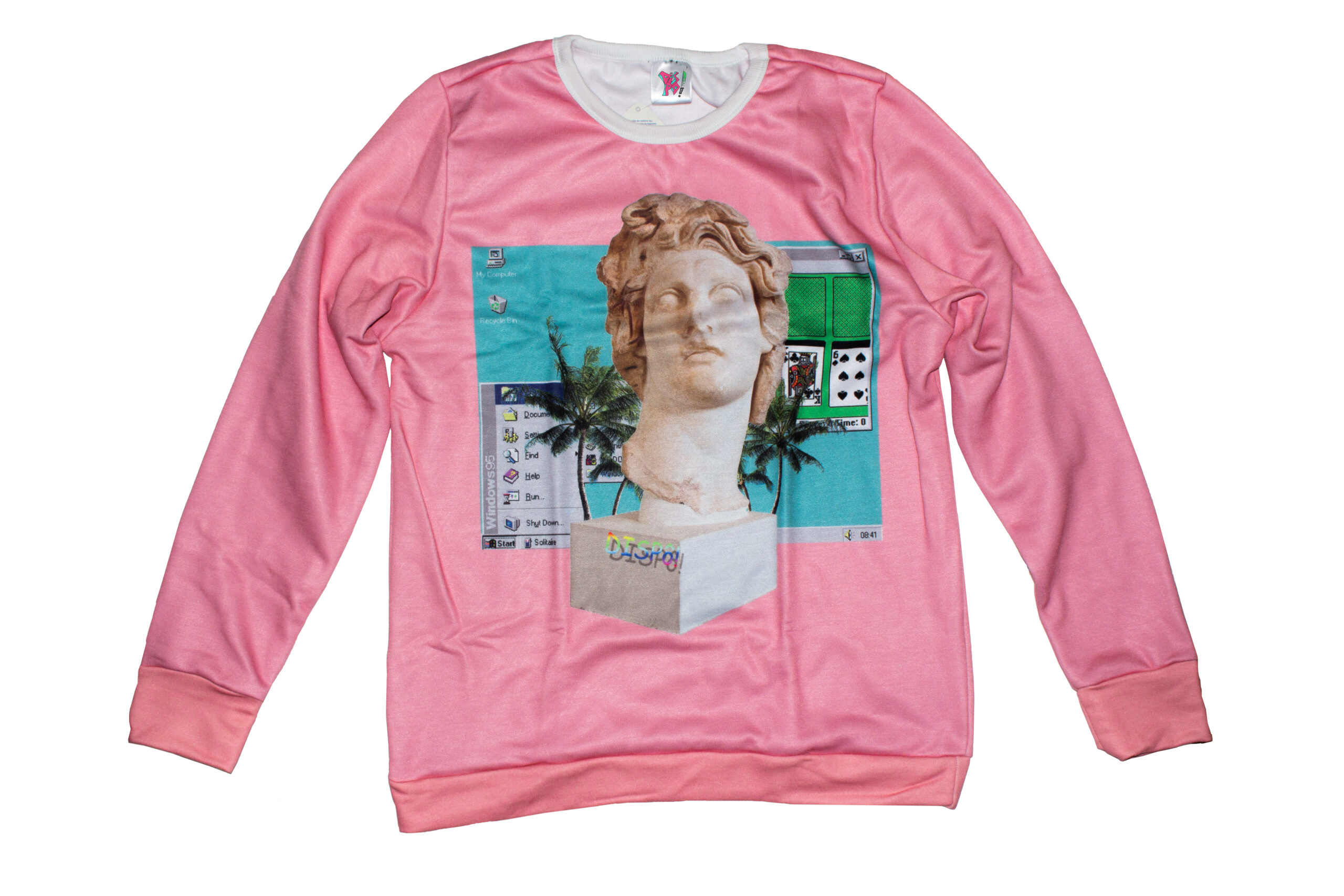 O resultado foi esta estampa-colagem. A fusão do mármore grego, que é eterno, com a estética efêmera do primeiro software gráfico—o paraíso virtual das palmeiras de 16-bits e os ícones de um sistema operacional esquecido. É a materialização da anacronia, a transformação de um conceito abstrato em arte tangível.