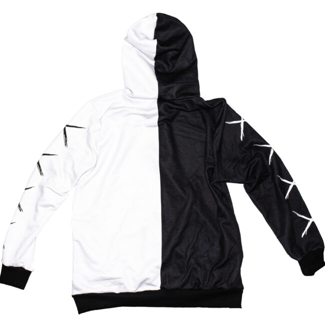 O corte bicolor e o sorriso distorcido não são apenas design; são um alerta de humor para quem chega perto. É o equilíbrio precário entre a luz e a sombra, costurado no meio do peito.